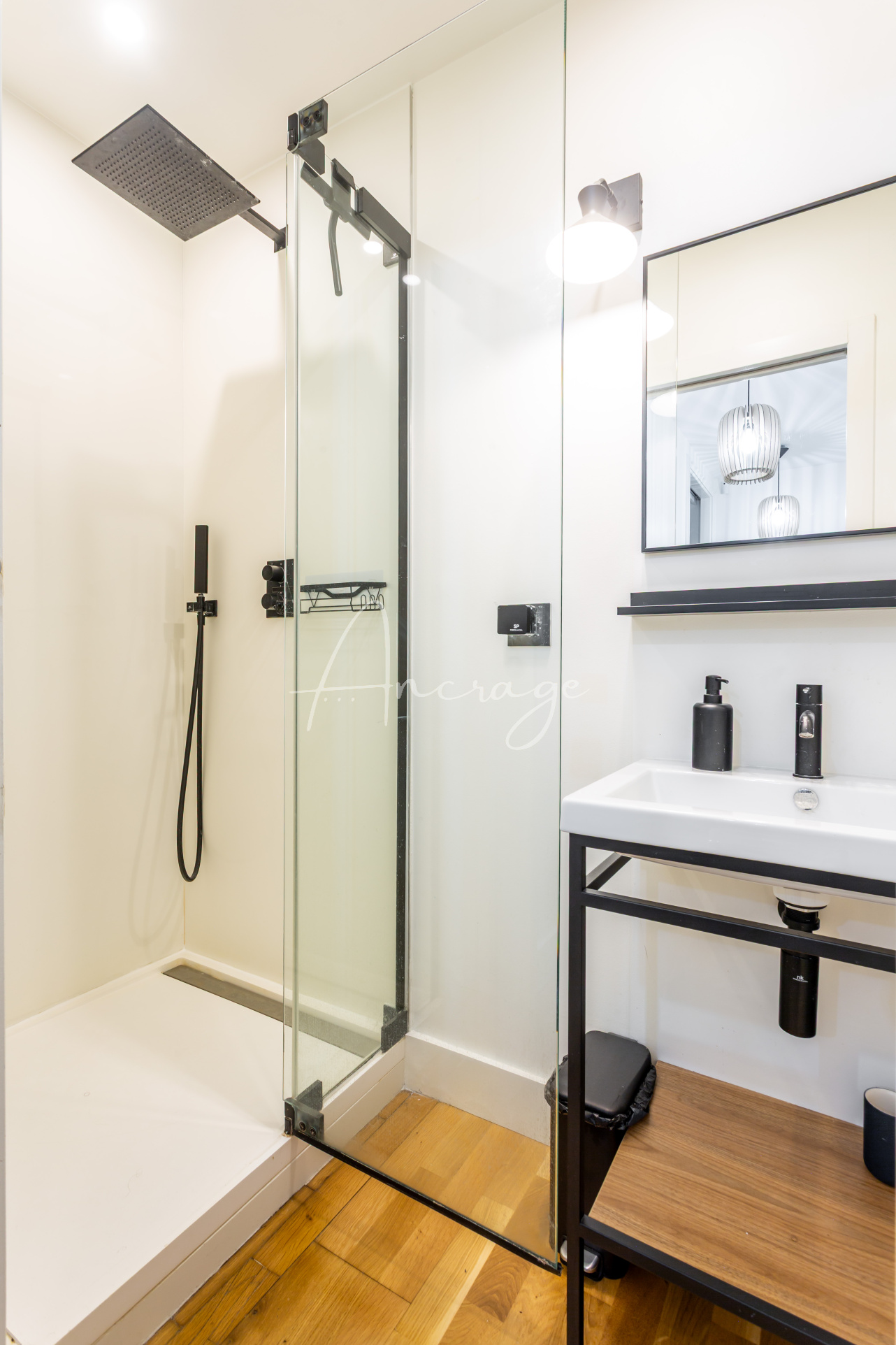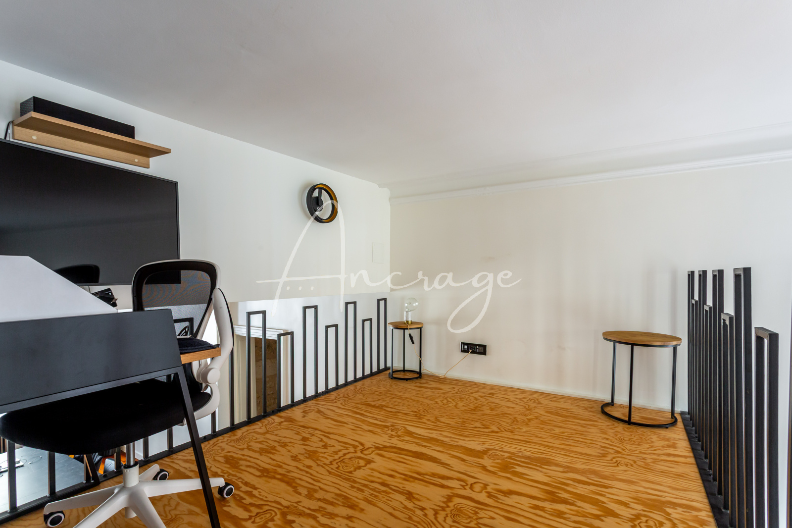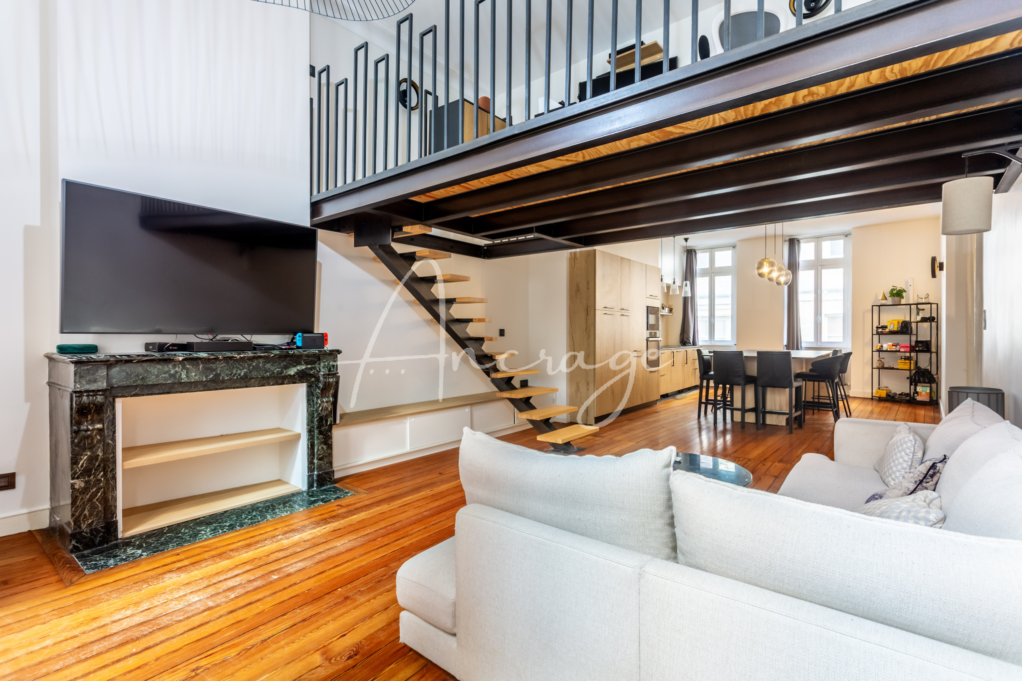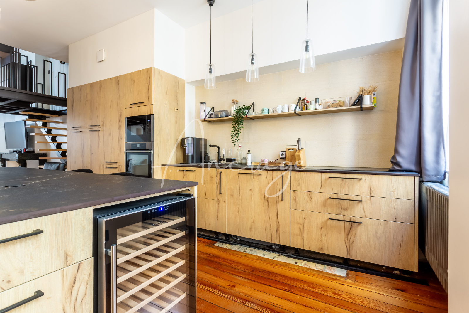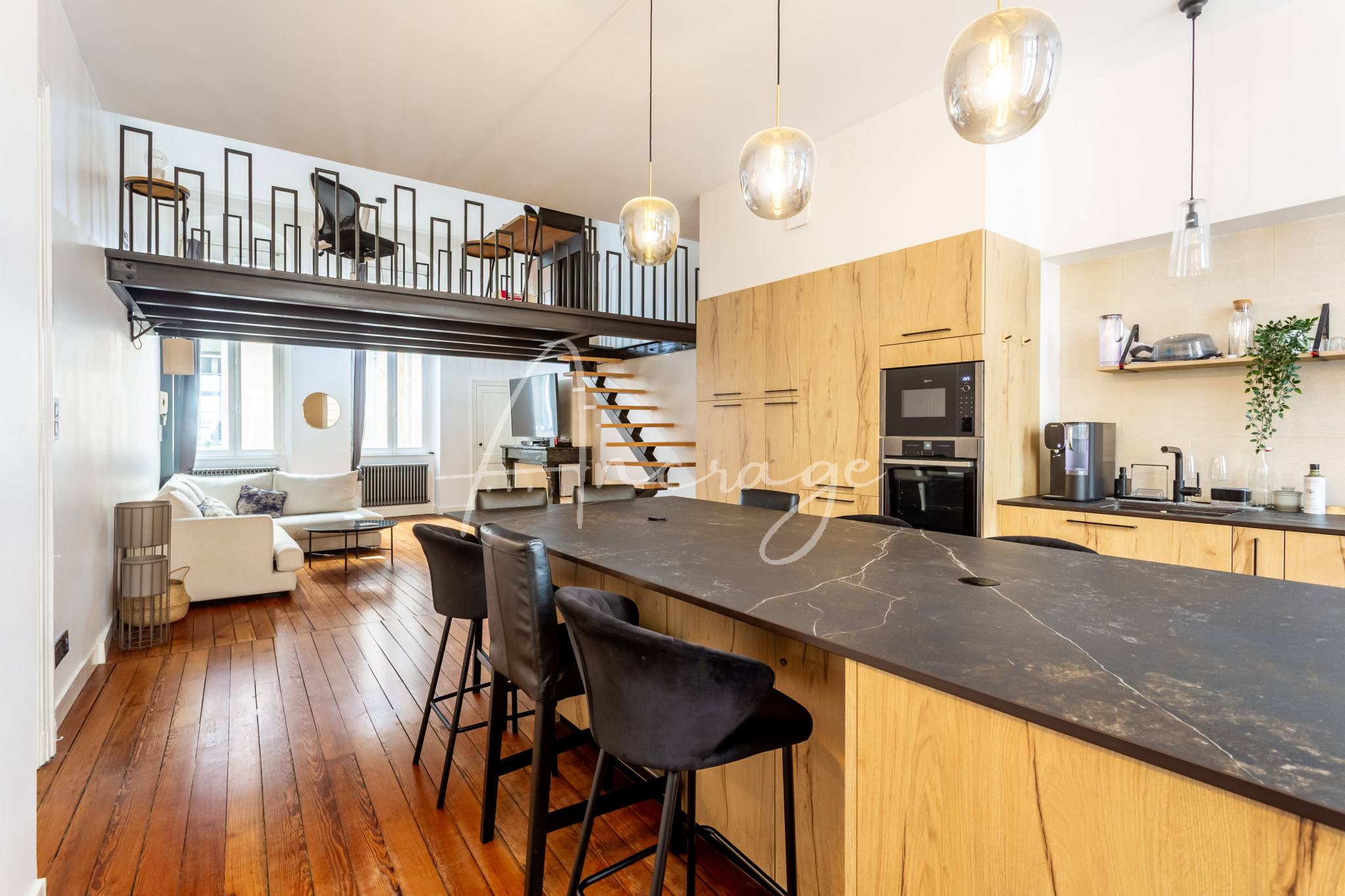 Le premier niveau accueille une vaste pièce de vie traversante avec cuisine ouverte, un dressing d’accueil ainsi qu’un espace bureau en mezzanine, créant un lieu de vie à la fois élégant et convivial.